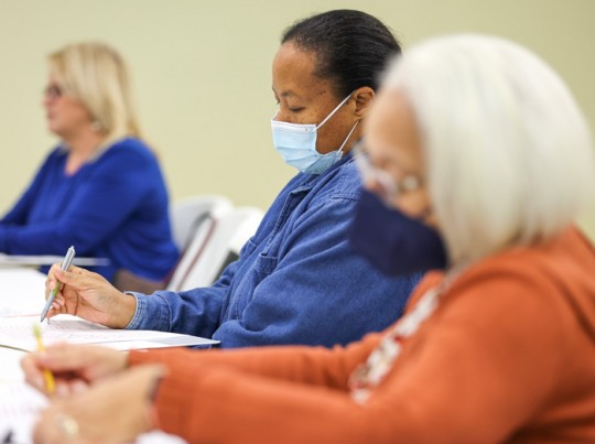 Pictured top: Consultant Buz Eddy speaks to the Century Charter Review Committee as chairperson Mary Bourgeois listens. Pictured below: Committee member Michelle Cunningham (center) takes notes during a recent meeting. NorthEscambia.com photos, click to enlarge.