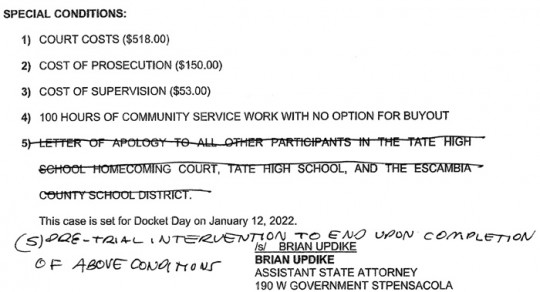 The original agreement, as obtained by NorthEscambia.com, also required Grover to write a “letter of apology to all other participants in the Tate High School Homecoming Court, Tate School and the Escambia County School District”, but that condition was removed before it was finalized.