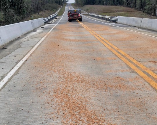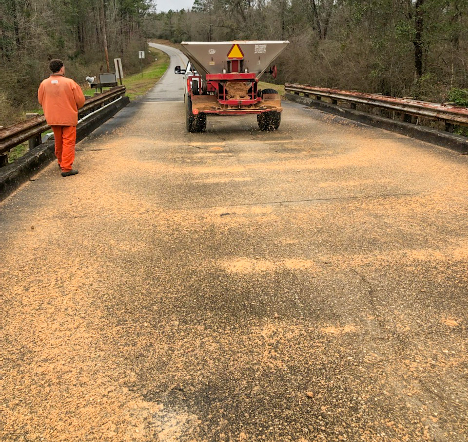 County crews sanded bridges across North Escambia Sand improves traction in the event of ice on a bridge.
