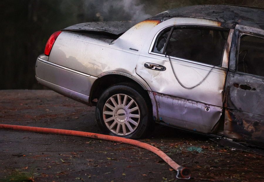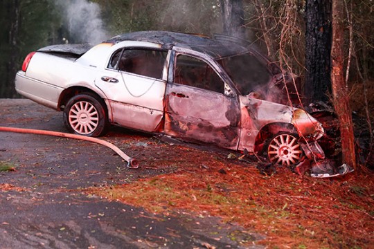The silver car was westbound on Highway 4 when it left the roadway and crashed head-on into a large tree about 5:50 a.m. After colliding with the tree, the vehicle became engulfed in fire killing the driver, according to FHP.