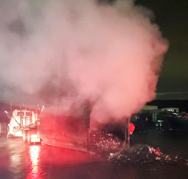 Smoke was reported from the Materials Recycling Facility (MRF) about 7:25 p.m. Escambia Fire Rescue discovered the fire in a roll off compactor located at the end of the processing line inside the facility. The compactor was partially extinguished and moved outside the 53,000 square foot facility before the fire was out.