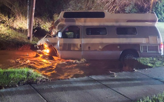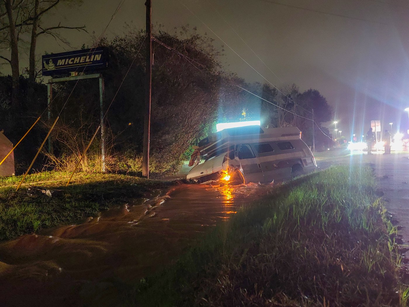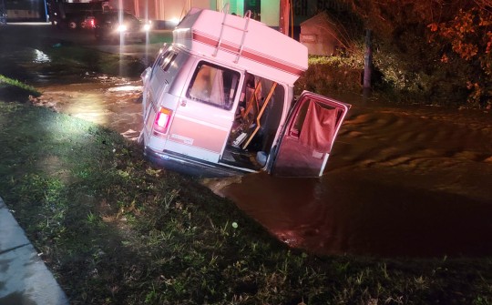 It appeared the van struck and sheared off a fire hydrant, causing the ditch to rapidly fill with water and become a raging river that washed away the shoulder of the roadway.