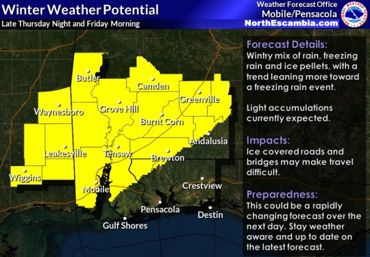 The National Weather Service says a wintry mix is possible in the North Escambia area early Friday morning. Freezing rain or ice pellets could mix in with rain leading to light accumulations (yellow area in the map above). Roads and bridges could become icy, leading to travel problems.