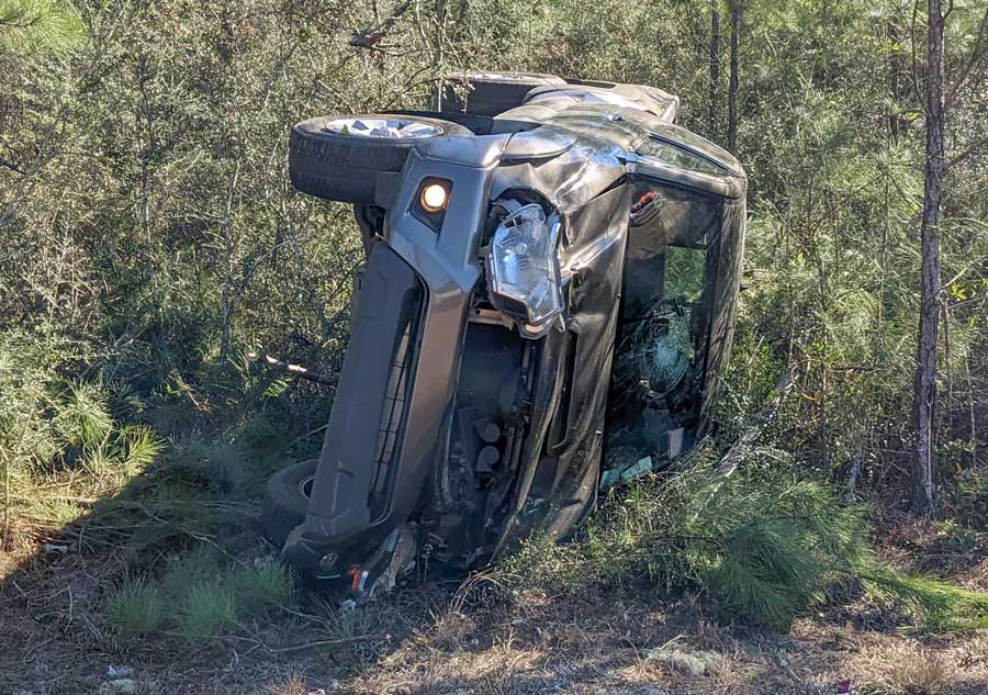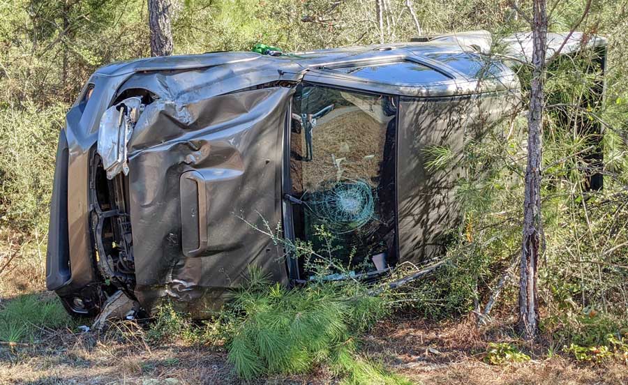 The Florida Highway Patrol said a 75-year old Atmore man attempted to pass the bus, before his vehicle collided with the lug nuts on a wheel of the bus. The pickup truck then overturned into a wooded area. The pickup truck came to rest on its side, and the driver was able to climb out of the vehicle.