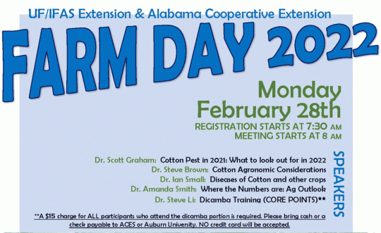 UF/IFAS Extension and Alabama Cooperative Extension will hold Farm Day 2022 on Monday, February 28 at Grace Fellowship Church in Atmore. Registration will begin at 7:30 a.m.