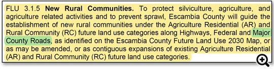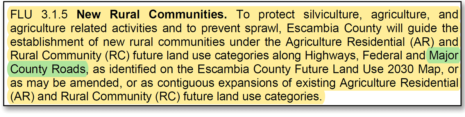 According to Escambia County’s Comprehensive Plan, the agricultural residential zoning designation is allowed along highways, federal and “major county roads” as identified in the Escambia County Future Land Use Map.
