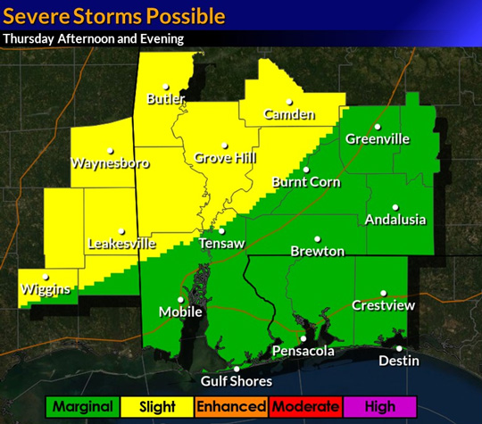 An approaching cold front will bring a threat of severe weather for Thursday afternoon and evening.