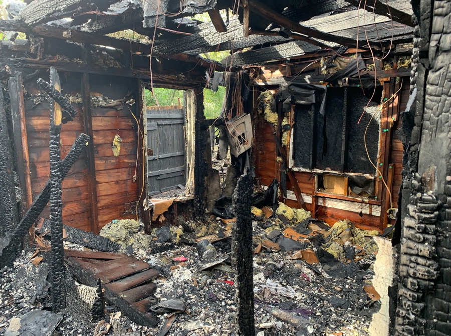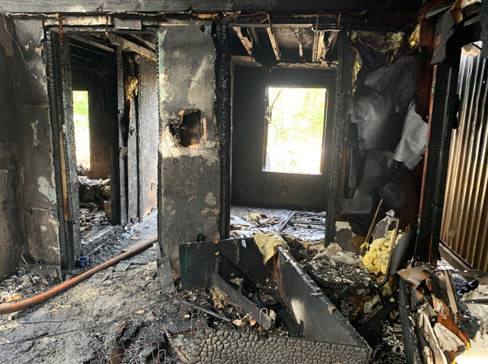 A firefighter reportedly fell through a rotted floor inside one of the structures. He was transported to an area hospital for treatment.