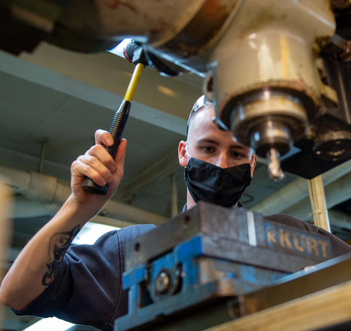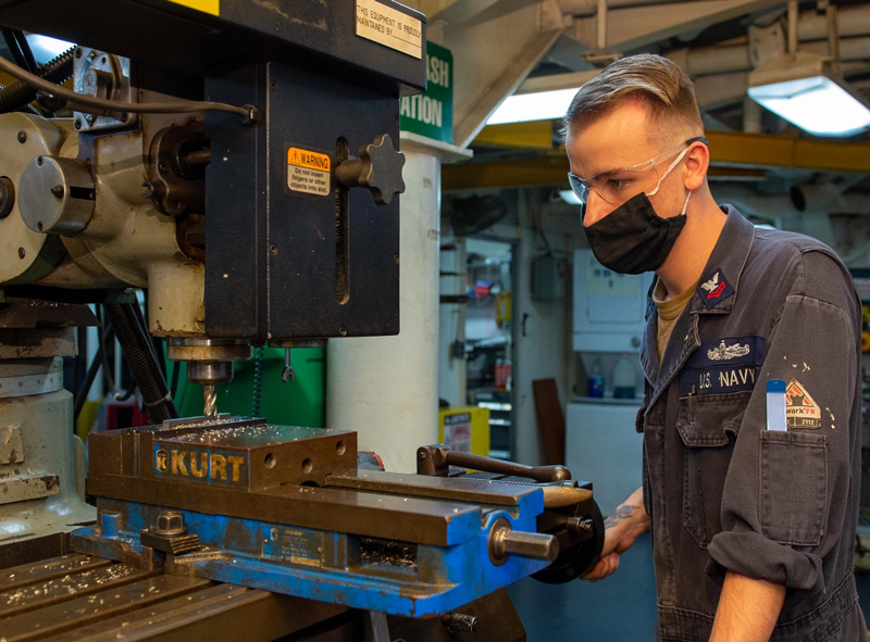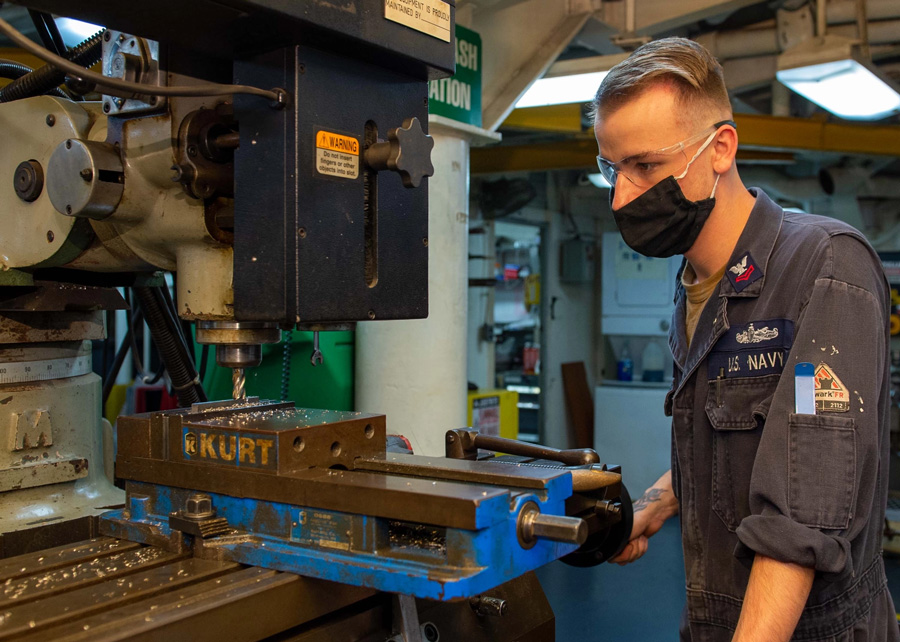 Odom is pictured using a drill to make a key in the repair shop aboard the USS Harry S. Truman.