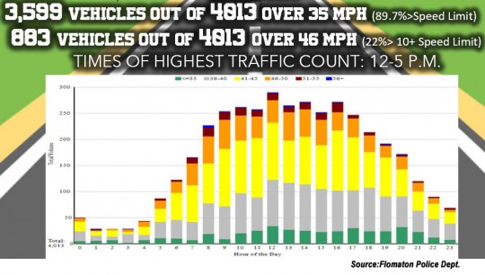 Last Saturday, February 19, the trailer’s radar clocked 4,013 vehicles headed north out of Florida. Almost 90% of vehicles were speeding with 3,599 traveling over the posted 35 mph. There were 883 vehicles, 22%, traveling over 46 mph — more than 10 mph over the limit.