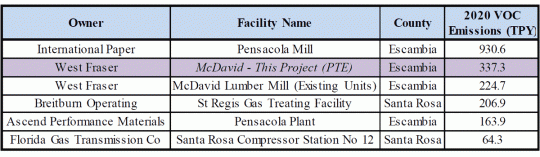 According to FDEP, West Fraser currently has the second highest emission level of volatile organic compounds in Escambia County, and that amount will increase by 50.1%, but remain about one-third of the VOC emissions from International Paper. (See FDEP table above, click to enlarge.)