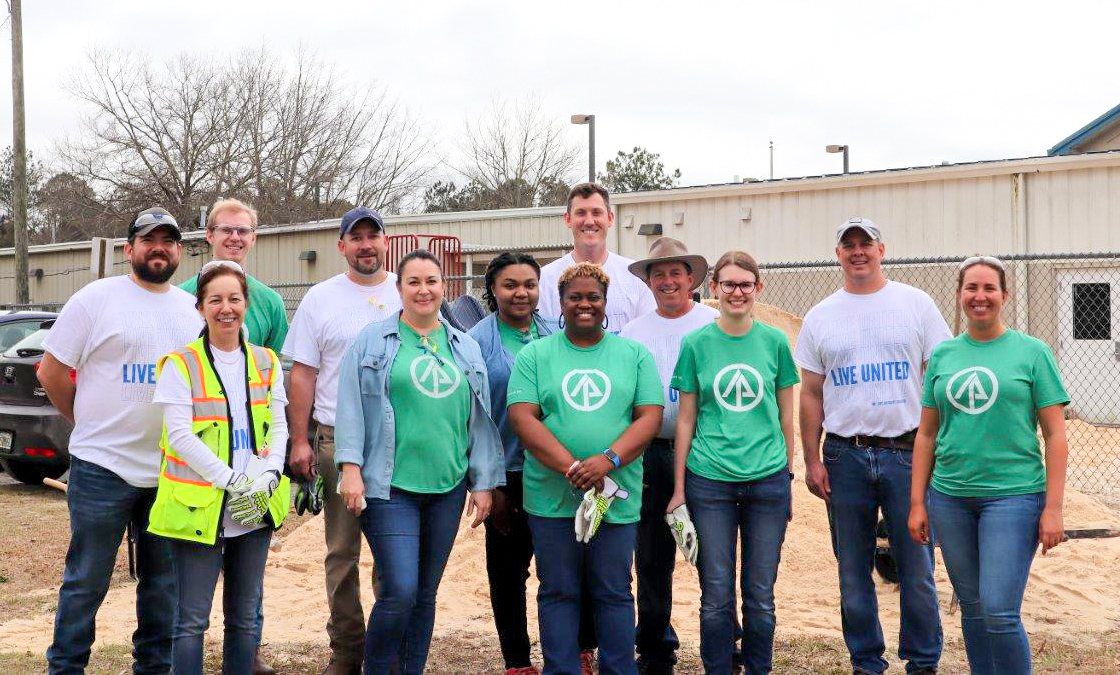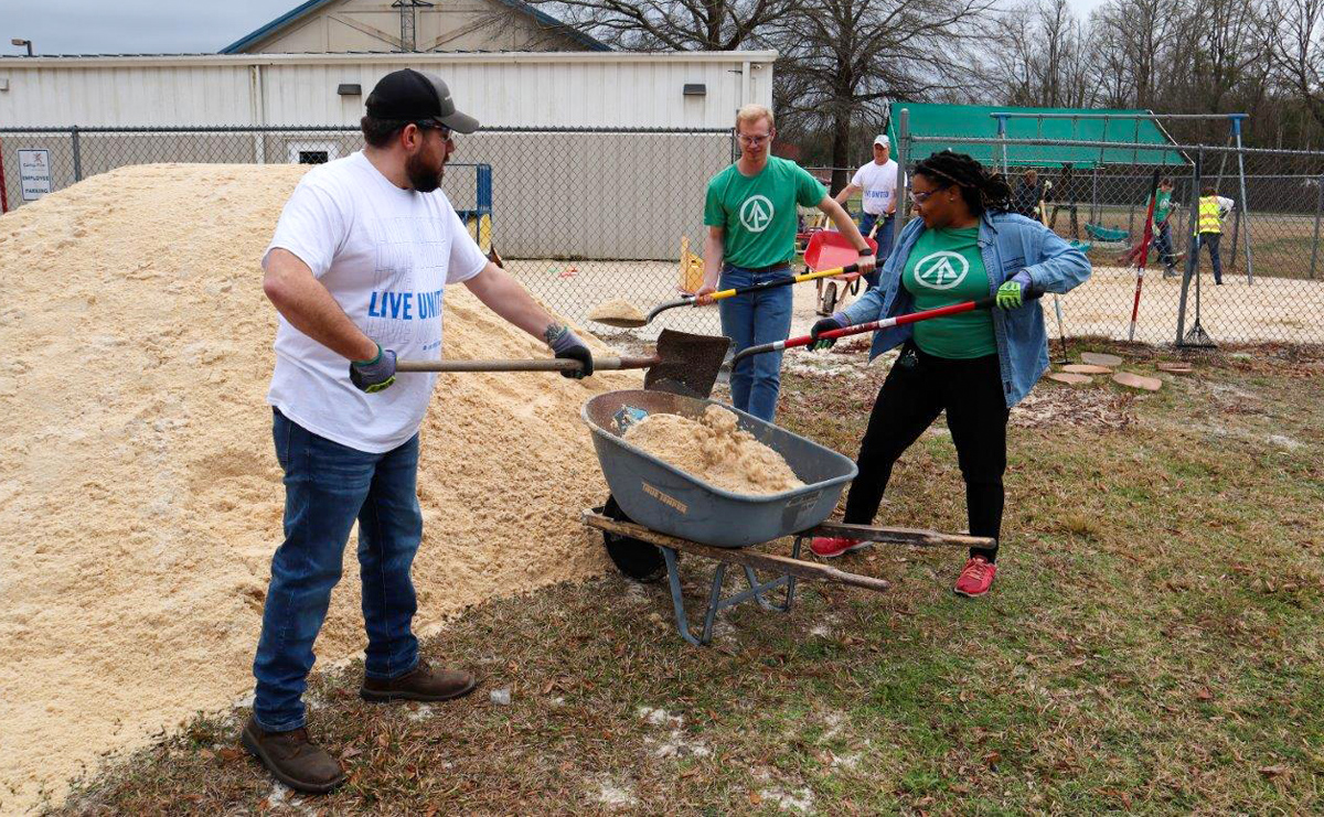 International Paper team members volunteering with United Way Day of Caring at Camp Fire Century Youth Learning Center. Volunteers spread and raked new sand on the playground and pressure washed the building and signs.