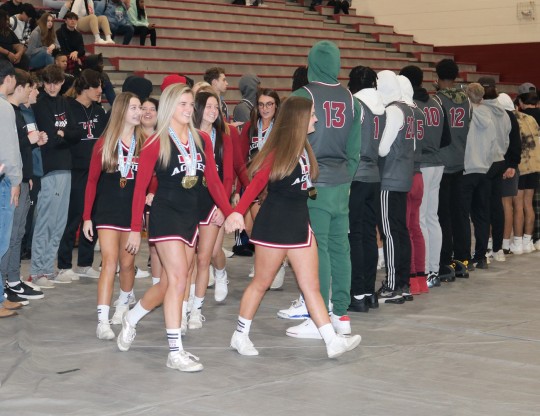 The state champ cheerleaders were honored last Thursday night at a basketball game where the Aggies beat Milton and on Friday a pep rally in their honor. During the pep rally, the varsity cheerleaders were led into the gym by the Showband of the South through a spirit tunnel of other athletic teams, including baseball, softball, basketball and the junior varsity cheerleaders.