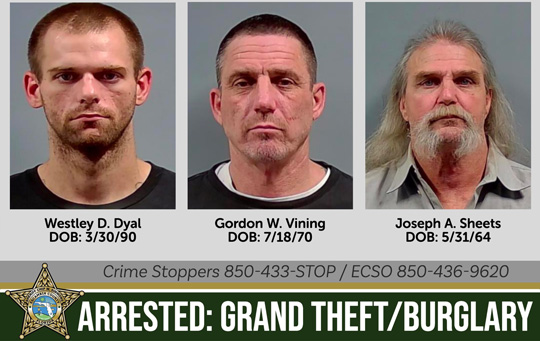 Westley David Dyal was charged with grand theft and burglary of an unoccupied conveyance. Gordon Woodfin Vining and Joseph Allen Sheets were both charged with burglary of an unoccupied structure, burglary of a vehicle, grand theft, and criminal mischief.