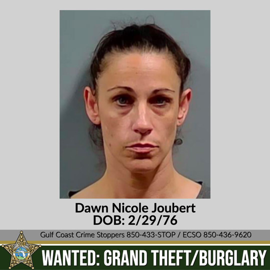 ECSO investigators are still looking for Dawn Nicole Joubert. She is wanted for burglary of an unoccupied structure, grand theft, and criminal mischief. If you have any information about Joubert’s whereabouts, call the ECSO at (850) 436-9620 or Crime Stoppers at (850) 433-STOP.