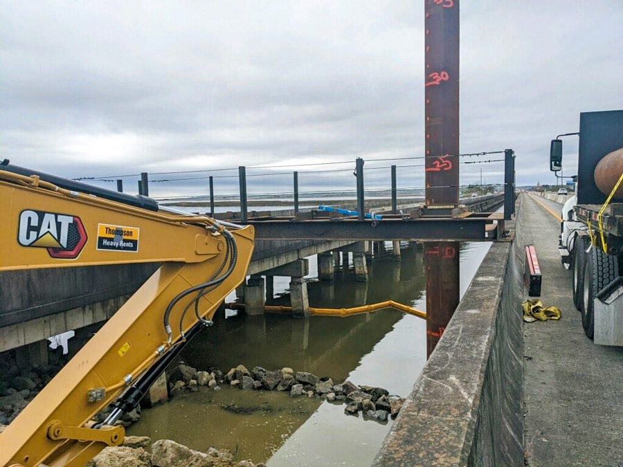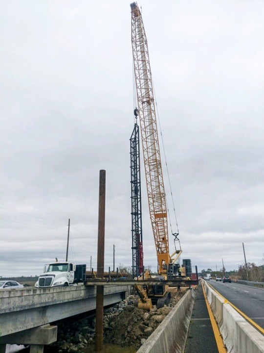 Crews have finished installing a temporary barrier wall and have started construction of a temporary work trestle (center) that will be between the westbound and eastbound bridges. Once the work trestle or temporary bridge is complete, the team will begin driving concrete piles for the widening of the westbound bridge.