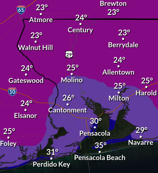 There is a freeze warning in effect for the entire area tonight. Sub-freezing temperatures in the low to mid-20s are expected north of I-10, with temperatures in the upper 20s to around 30 degrees all the way to the coast.