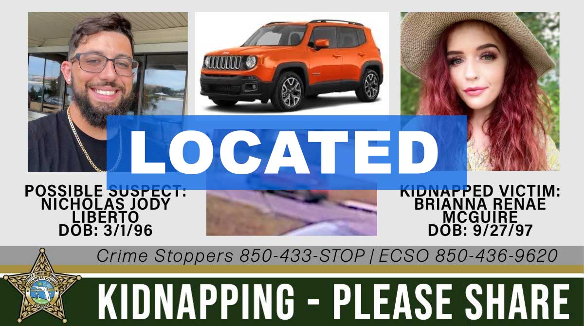 In a statement, ECSO said, “Just before 4:00 this afternoon, Brianna McGuire was safely located at a home in Escambia County. Nicholas Jody Liberto has also been located. This is an ongoing investigation.”