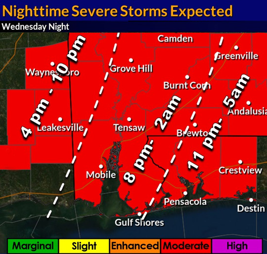 Severe weather is expected tonight across the North Escambia area with a rare 4 out of 5 chance.