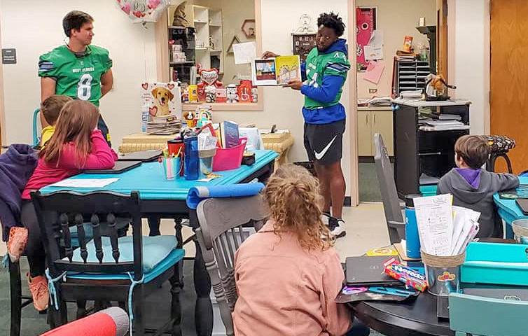 Members of the University of West Florida Argos football team read books to students Wednesday at Pine Meadow Elementary School.