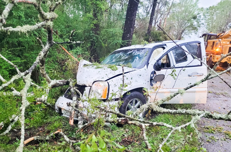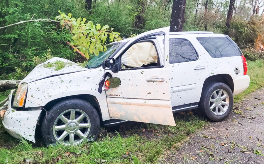 “He hit it and then sailed through the tree debris and into the ditch,’ Amanda said. “Thankfully he walked away with a busted lip and soreness from the air bag and that’s it.”