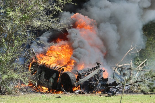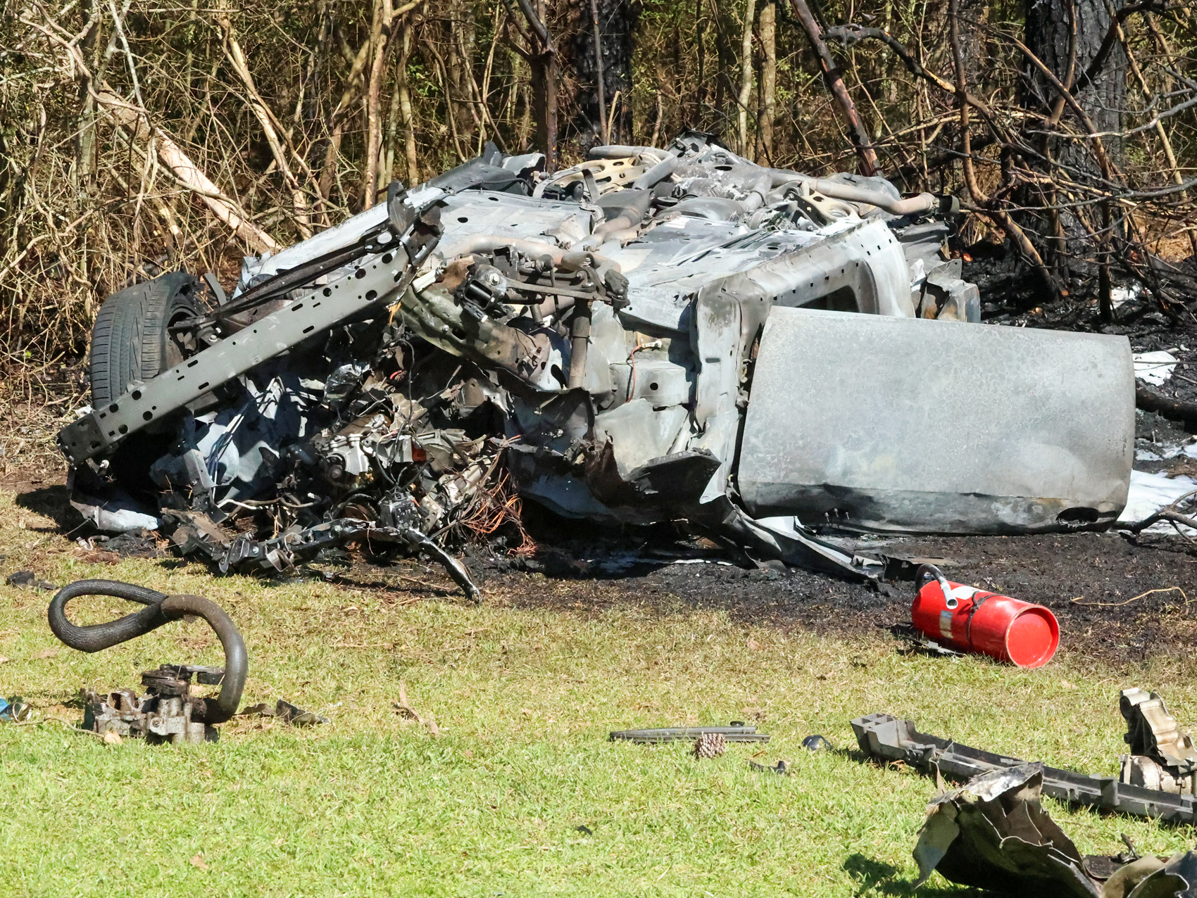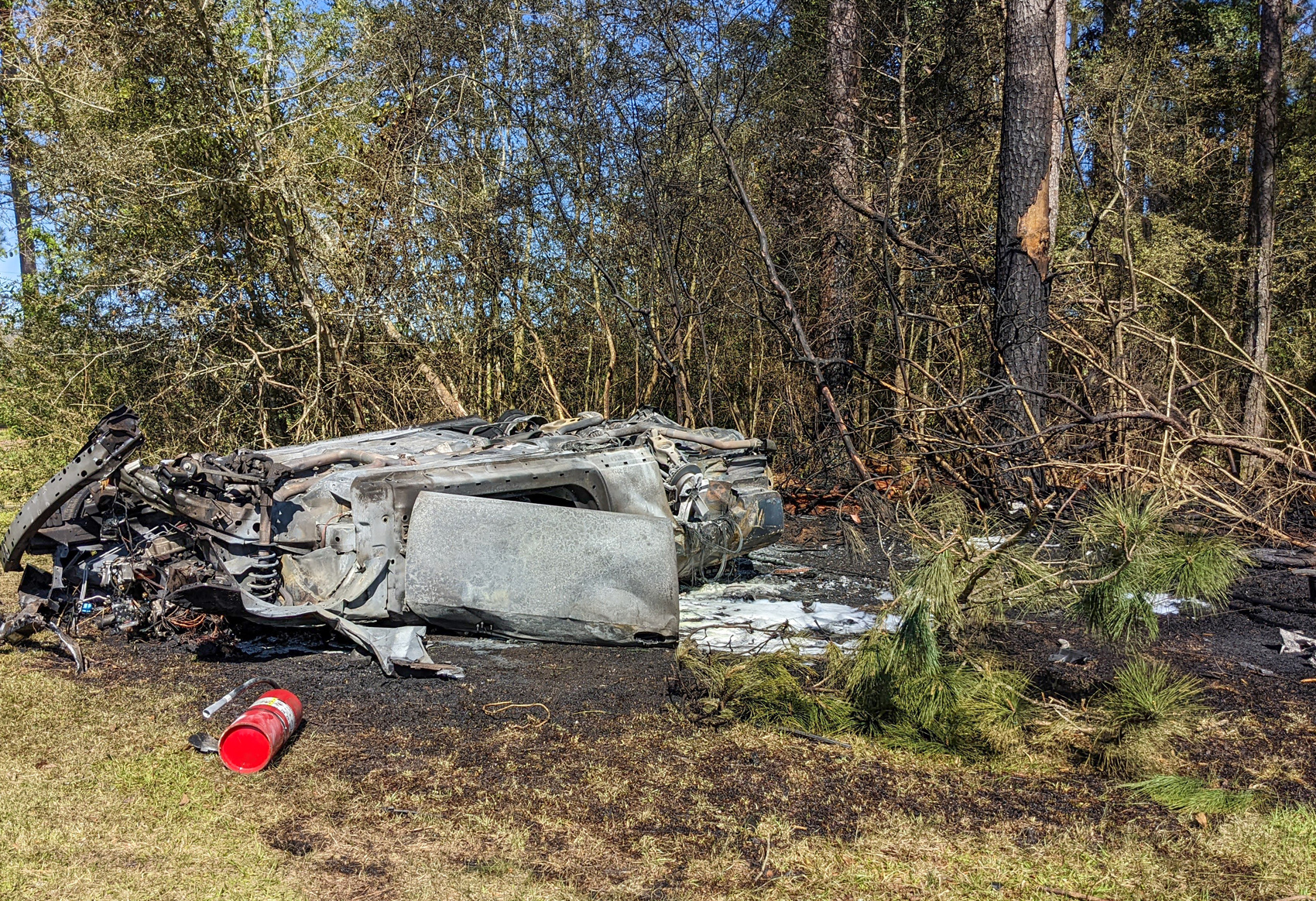 The 65-year old male driver of a black Dodge Challenger lost control while northbound on Highway 97 just north of Tungoil Road. The vehicle failed to negotiate a curve and left the roadway. The vehicle hit a culvert, went airborne for about 180 feet before crashing into a ditch. The Dodge then collided with a large pine tree about 12 feet off the ground. The gas tank was ruptured, and the vehicle burst into flames. It was fully engulfed when first responders arrived on scene.
