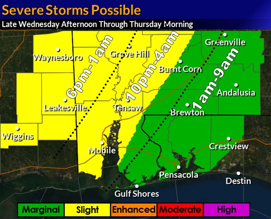 There is a marginal risk of severe storms in the North Escambia area into the early morning hours Thursday. Damaging winds, large hail, and a tornado are possible.