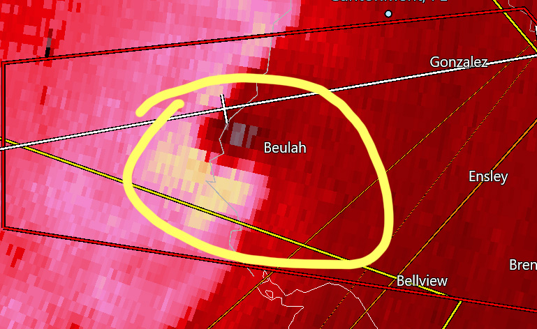 The last two images below show the areas included in the tornado warnings and an area of circulation near Beulah.
