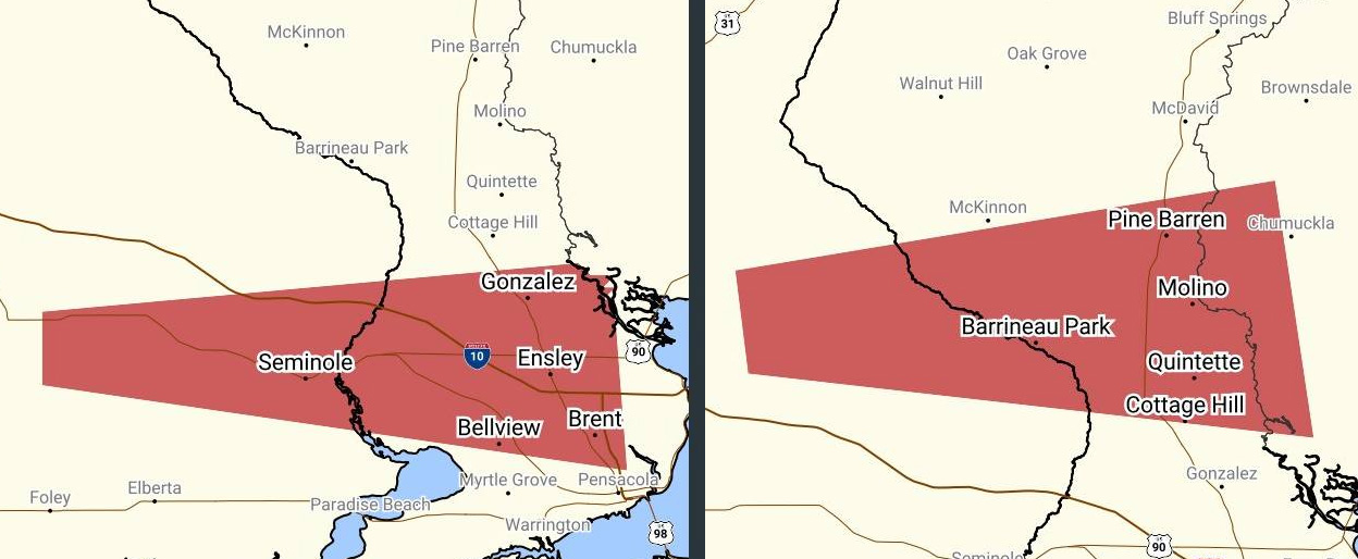 Storms that moved through Escambia County prompted two simultaneous tornado warnings, but there were no confirmed touchdowns.