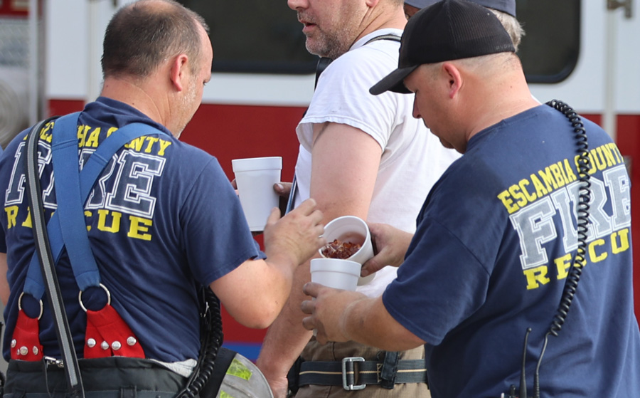The firefighters stood around sipping sweet tea, like family at Sunday dinner. Come to think of it, they are family.