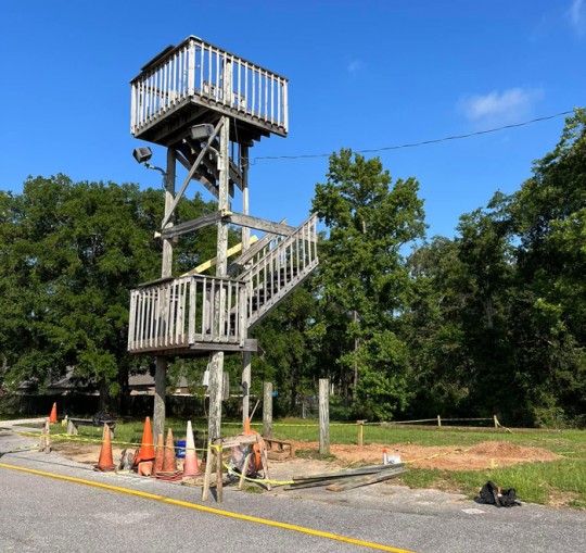 “The first tower was located on the original front sideline facing the visitor bleachers. It was put up in the mid 70’s,” District 5 Escambia County School Board member Bill Slayton wrote on social media. He was the band director for the Showband of the South from 1971 to 1987. “This tower (pictured) was put up when the new cafeteria was built and the field was turned 90 degrees.”