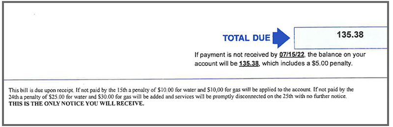 “This bill is due upon receipt. If not paid by the 24th, a penalty of $25 for water and $30 for gas will be added and services will be subject to disconnection on the 25th with no further notice. This is the only notice you will receive.”
