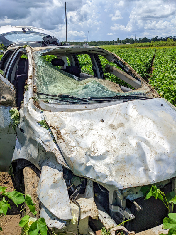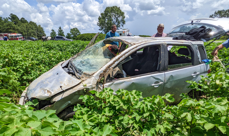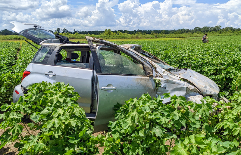 The vehicle was apparently southbound about a half mile south of Tungoil Road when the driver lost control, crossed a ditch and ran into the cotton field. The vehicle then became airborne and overturned, coming to rest upright about 40 feet into the field.