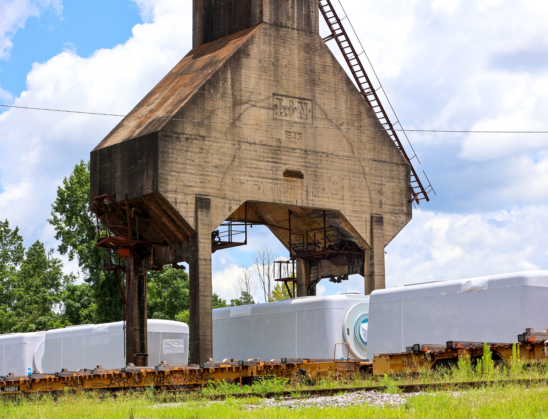 Pictured: A 1943 L&N Railroad coaling tower on the Alabama-Florida line in Flomaton, Alabama, as seen July 16, 2022. The top photo shows the size of the structure as CSX engines pass underneath. The bottom photo shows electric wind turbines passing under the coal tower. NorthEscambia.com photos, click to enlarge.