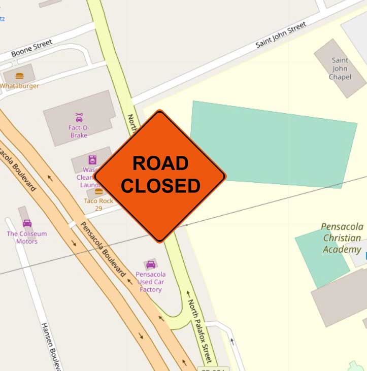 Southbound Palafox Street will be closed Monday and Tuesday from Saint John Street to Highway 29 (near Pensacola Christian College).