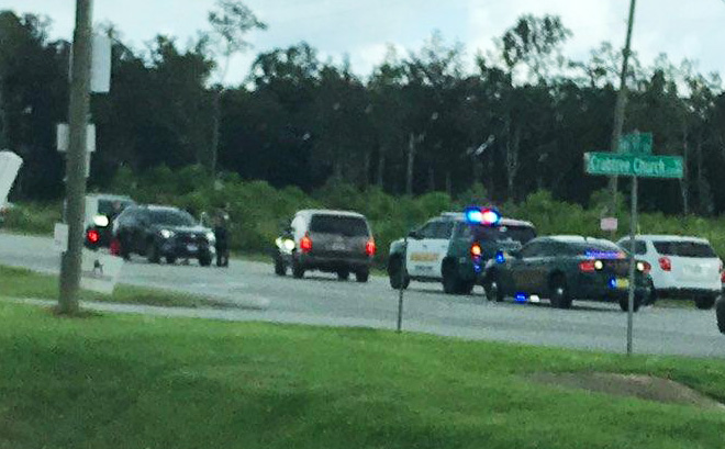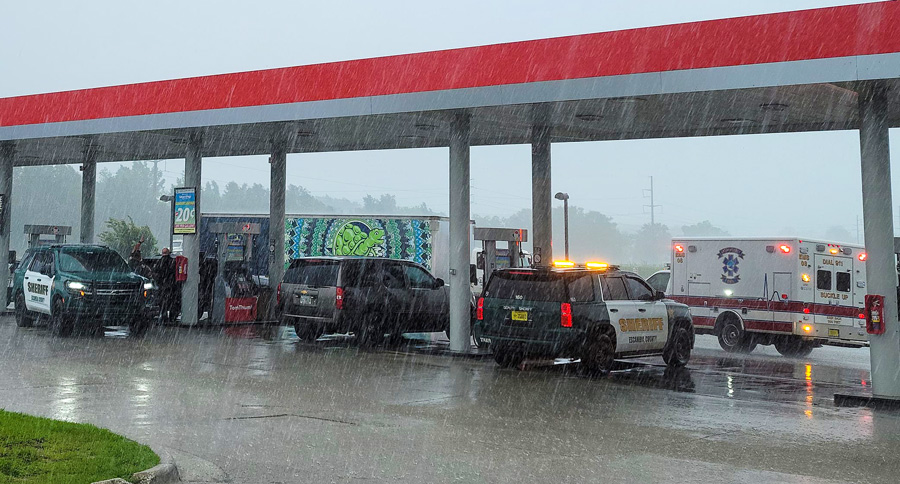 Pictured top: The first Escambia County Sheriff’s Office deputy on scene conducts a traffic stop on a SUV Wednesday on Highway 97 at Crabtree Church Road. The suspect is believed to be the individual seen on the roadway to the right of the SUV, while the victim is to the left in the photo. Pictured first below: Another view of the traffic stop as more deputies arrive on scene. Pictured bottom two photos: The investigation was moved under the canopy at the Tom Thumb during a rainstorm. NorthEscambia.com photos by Kristi Barbour and reader submitted photos, click to enlarge.