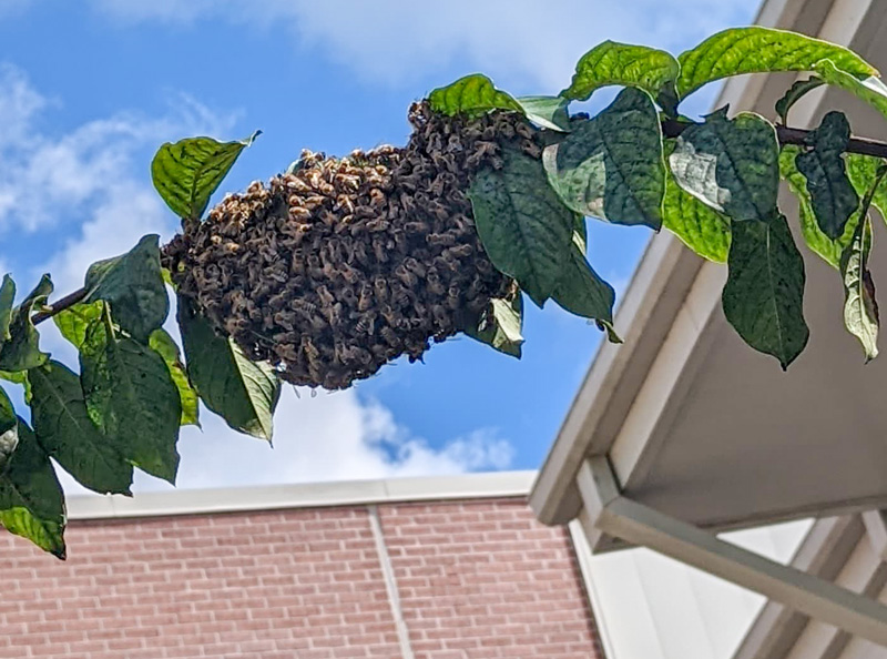 BMS tech coordinator Laura Lee discovered the bee swarm on a tree branch in the courtyard outside her window.