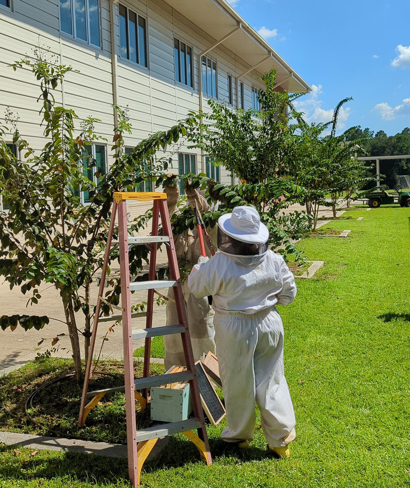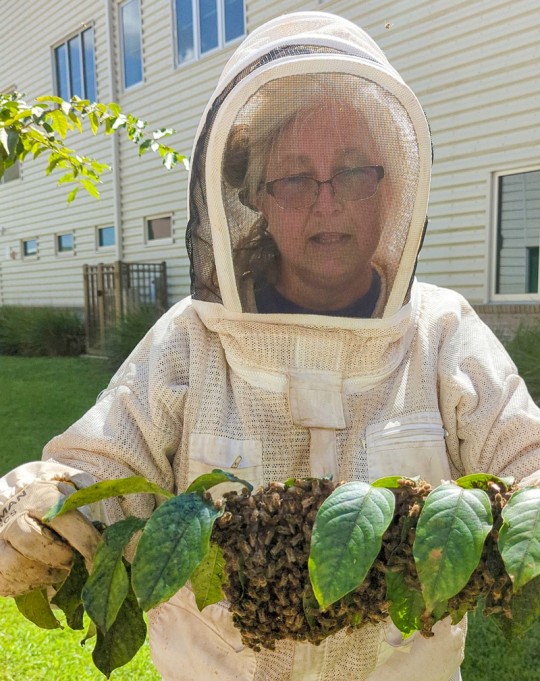 Joan Strickland from Urban Farmer Supplies beekeeping in Molino and Beulah Middle agriscience teacher Charlotte Davis suited up and went to work. They carefully harvested the bees and lowered them in a nuc — that’s a smaller version of the traditional wooden beehive. The bees were not happy with the move and flew to the next tree.