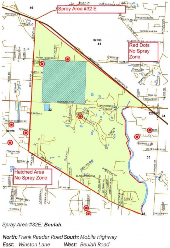 Escambia County Mosquito Control plans to spray in three zones Wednesday evening in Beulah, Gonzalez and Pleasant Grove.