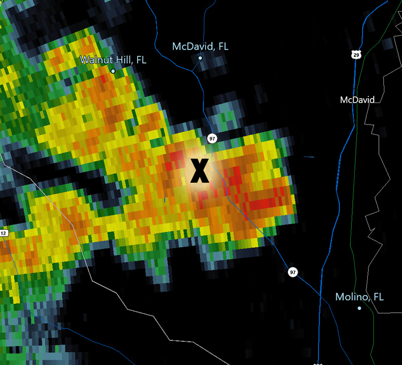 The approximate location of the lightning strike is marked on the radar image above from about the time of the incident.