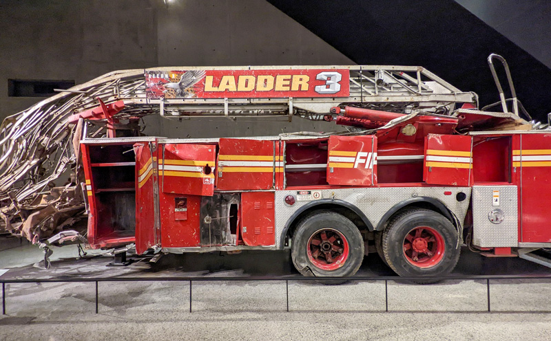 Pictured: Ladder 3 in the National 9/11 Memorial Museum in New York City. The truck’s crew was last known to be on the 35th floor of the North Tower when it collapsed. None survived. NorthEscambia.com photo, click to enlarge.