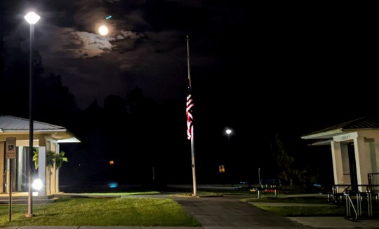 Pictured: The flag at half staff Thursday night between the Century Town Hall (left) and the Century Branch of the West Florida Library. NorthEscambia.com photos, click to enlarge.