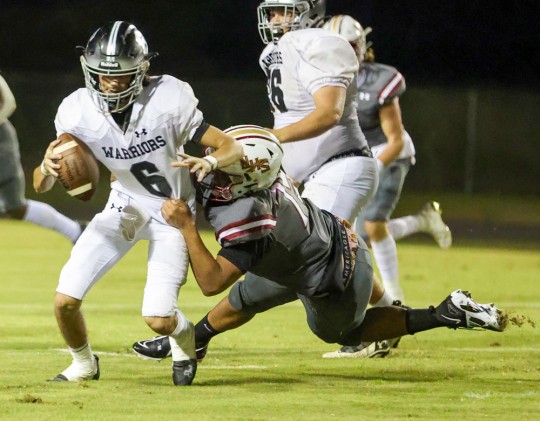 A pass from Tate’s Taite Davis was picked off in the endzone by Navarre, setting up Navarre’s offense on the 1-yard line. On a big tackle, Tate’s Conner Mason downed Navarre back in the endzone for a safety, making it 7-2 with 2:35 on the clock before the half.