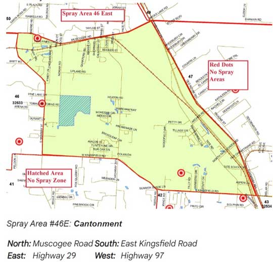 One spray area in Cantonment is bordered roughly on the north by Muscogee Road, East Kingsfield Road to the south, Highway 29 to the east and County Road 97 to the west.