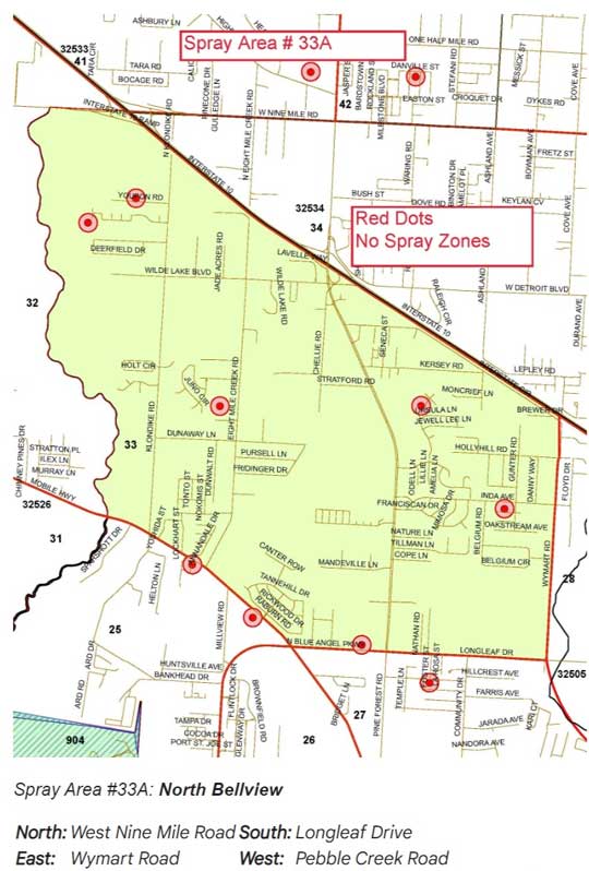 In Bellview, the spray area is bordered by West Nine Mile Road to the north, Longleaf Drive to the south, Wymart Road to the east and Pebble Creek Drive to the west.