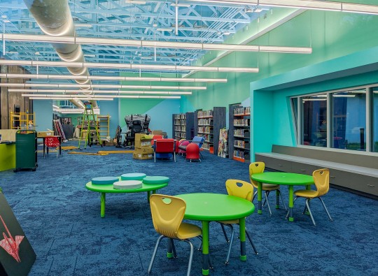 Inside, the library consists of a large open space divided into areas for a lobby, story time events, library service programs, leisure reading and more. The open floor plan provides entrances to other support spaces including multiple study rooms, a computer room and STEAM (Science, Technology, Engineering, Arts and Mathematics) room. The library plans to hold skill-building classes, daily hands-on activities and more.