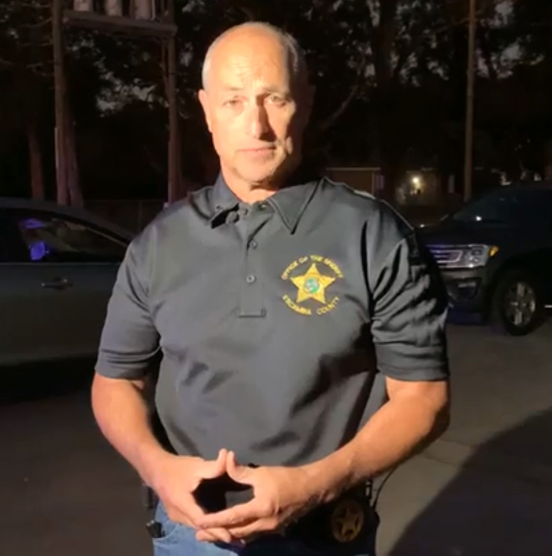 “There were two males wearing masks that engaged with the individual that right now is deceased. Shots were exchanged,” Escambia County Sheriff Chip Simmons said. “I would say that there were dozens of shots being fired.”