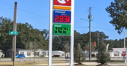 The average price per gallon Sunday night in Escambia County was $3.06. In North Escambia, one Highway 29 station was at $2.83 on Saturday and Sunday, while others were just over $3. In Pensacola, a low of $2.73 could be found at several stations.