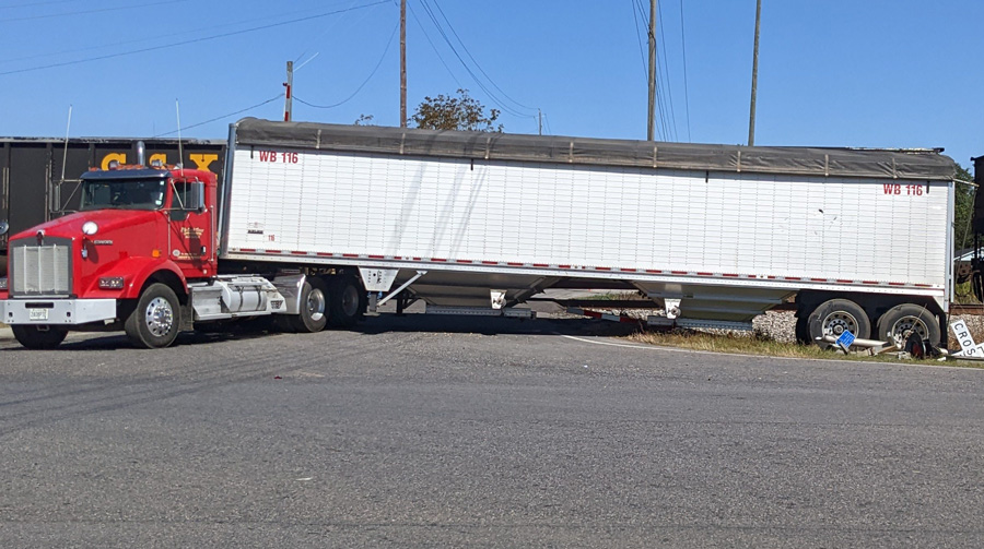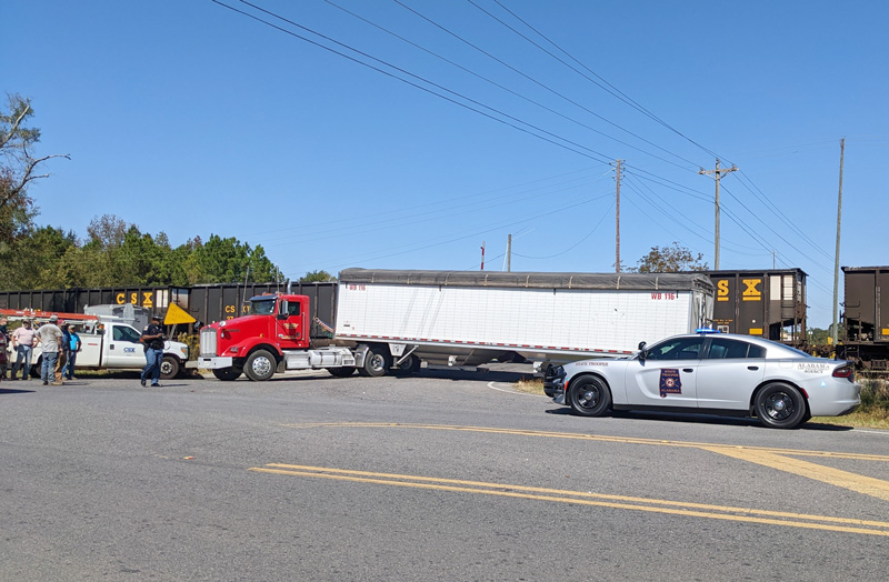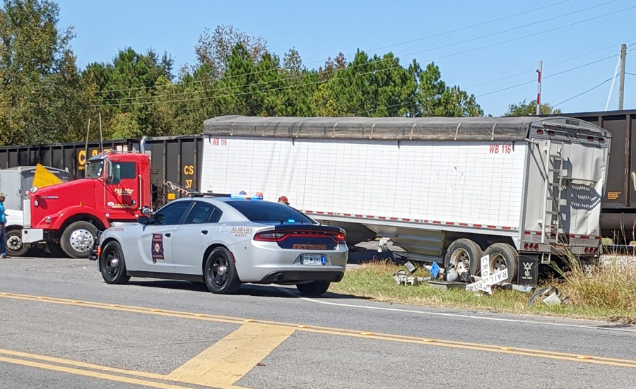 The CSX train hit the very back of the truck’s trailer, pushing it toward Highway 31 and destroying the railroad crossing sign.