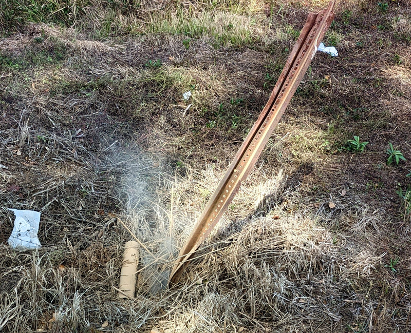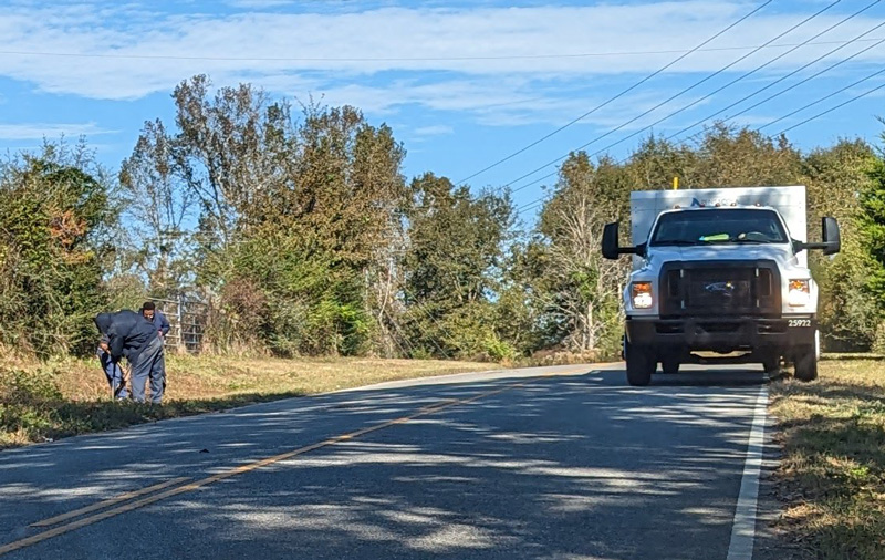 It appeared that a sign post was hit when the roadside was mowed in the last day or so, and the sign post may have damaged the pipe. The leak could be seen at times next to the post (look to the immediate left of the sign post in the photo above).